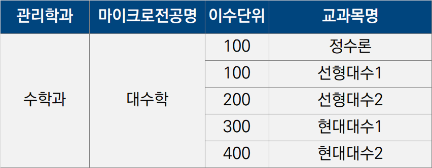 벡터공간, 군, 환, 체 등의 대수적 구조의 특성에 대해 학습한다. 추상화를 통해 문제를 구조적으로 이해하고 해결하는 방법을 습득할 수 있다. 이산구조를 통해 컴퓨터 과학의 원리를 습득하고, 여러 응용문제에 적용할 수 있다.