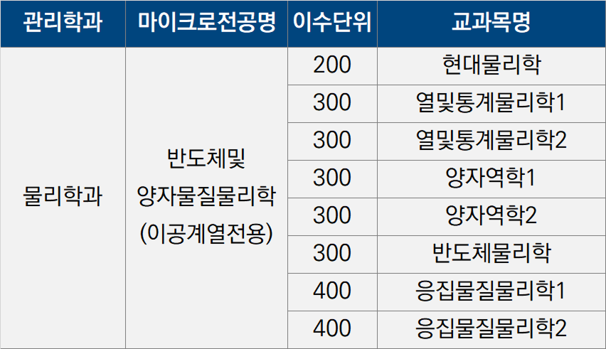 반도체 및 양자물질 물리학 마이크로전공은 양자 응집 물리학이라는 분야에 대한 포괄적인 탐구를 제공합니다. 학생들은 반도체와 양자 물질의 기본 원리, 특성 및 응용에 대한 깊은 이해를 얻게 됩니다. 이러한 물질을 연구하고 조작하는 데 사용되는 고급 실험 및 이론적 기법을 탐구하는 데 중점을 둡니다. 반도체 소자, 양자 컴퓨팅, 광전자공학, 에너지 변환 시스템과 같은 첨단 기술 개발에 기여하는 데 필요한 지식과 기술을 갖추도록 하는 것을 목표로 합니다. 전반적으로 이 마이크로전공은 학생들이 반도체 및 양자 재료 물리학 분야의 첨단 연구 및 산업계에서 훌륭한 역할을 수행할 수 있도록 준비시키는 것을 목표로 합니다.