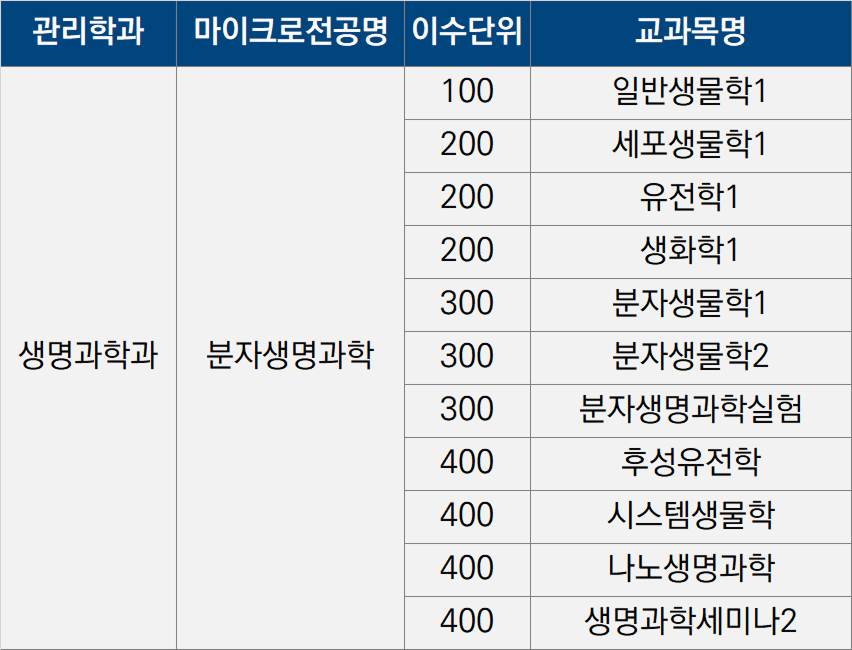 분자생명과학 마이크로전공에서는 생명의 구성요소와 배열, 세포의 구조와 기능, 에너지 대사, 세포분열과 유전 현상, 유전자의 구조와 기능, 유전체 분석 및 응용까지 전반적으로 분자수준에서의 생명체의 기능과 현상을 탐구한다. 또한, 생물학 분야의 발견과 지식이 인간의 삶과 사회에 어떠한 영향을 미치는가를 살펴보고, 관련 이슈와 문제를 제시하여 토론해 본다. 인공 세포, 유전자 특허, 암 진단 검사 및 치료제 등 여러 생명공학 기술, 제품, 제도 등에 대해 생물학적 지식과 연계하여 실제적 이해를 도모하며, 생명과학 전공자로서 필요한 기초지식과 탐구심을 배양한다.