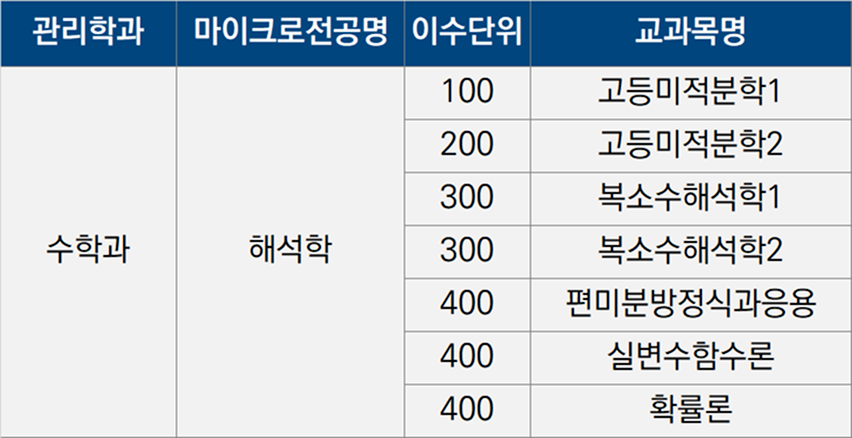극한, 연속, 미분, 적분, 측도 등의 개념에 대하여 수학적으로 엄밀한 정의와 이론들을 학습한다. 해석학 과목은 금융, 통계, 수치해석 등의 응용분야의 수학적 기반을 제공한다.