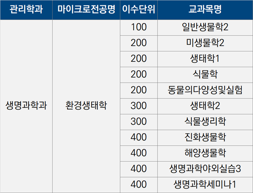 현재 지구에서는 급격한 환경변화로 인한 생태계 교란이 심각한 사회 문제로 대두되고 있다. 환경생태학은 우리가 살고 있는 지구 환경과 그 안에 존재하는 생명체들 간의 상호작용 및 영향을 연구하는 학문 분야로서, 이러한 환경 변화에 따른 생태계 변화를 이해하고 보전하는 방법을 탐구하여 지속 가능한 미래를 위한 해결책을 제시할 수 있다. 환경생태학 전공은 환경생태학 분야의 핵심 개념인 생태계의 구성과 기능, 생물 다양성, 생태학적 상호작용 등에 대한 학문적 지식을 전달하는 것뿐만 아니라, 응용 연구인 생태 기반 기술과 같은 폭넓은 경험을 제공하여 환경생태학 전공자가 필요로 하는 기초지식과 탐구심을 함양한다.